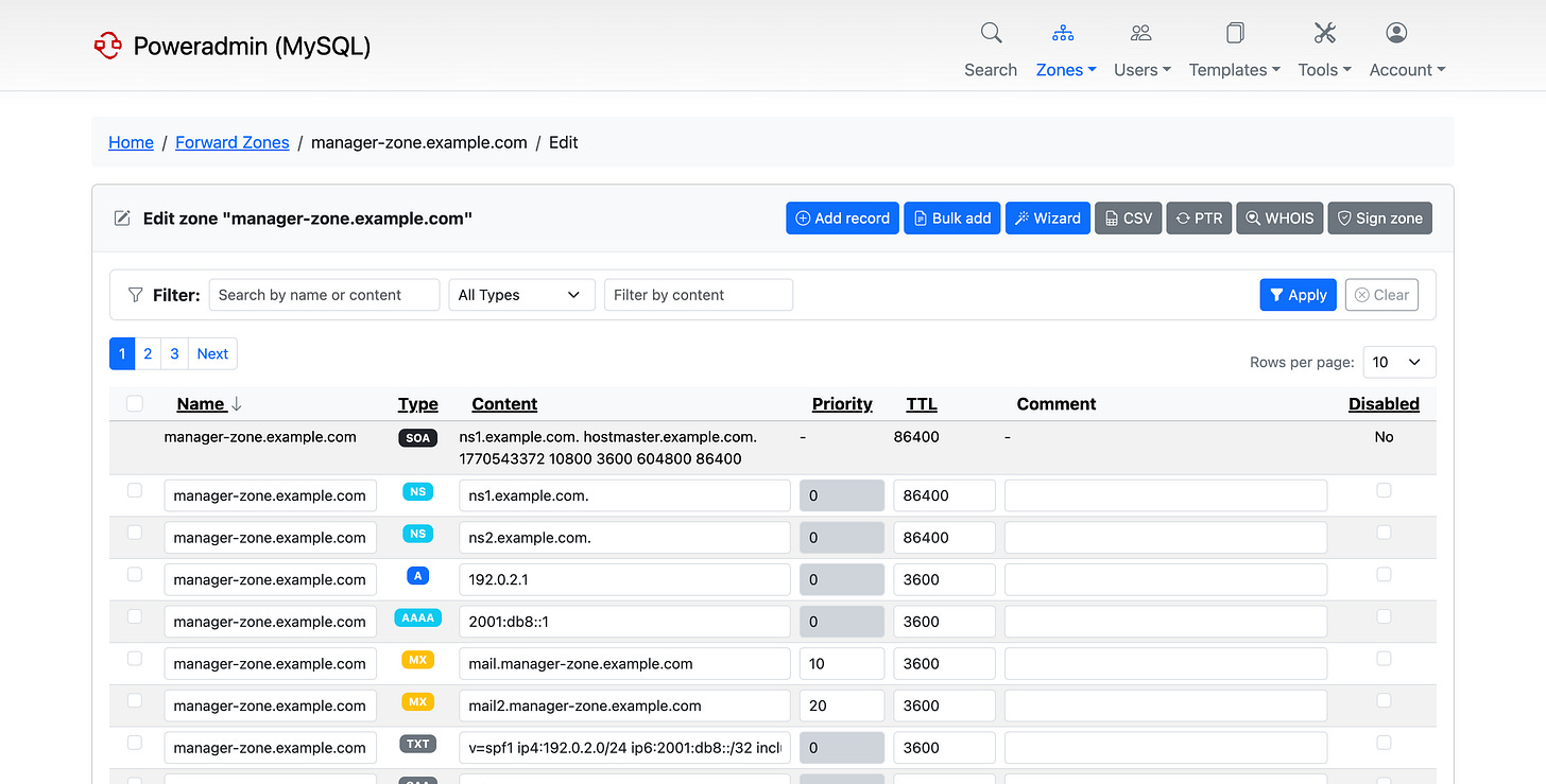 The zone editor got a rework - better layout, configurable columns, and sorting by owner, ID, or disabled status. You can now edit records inline and do bulk operations without leaving the page.