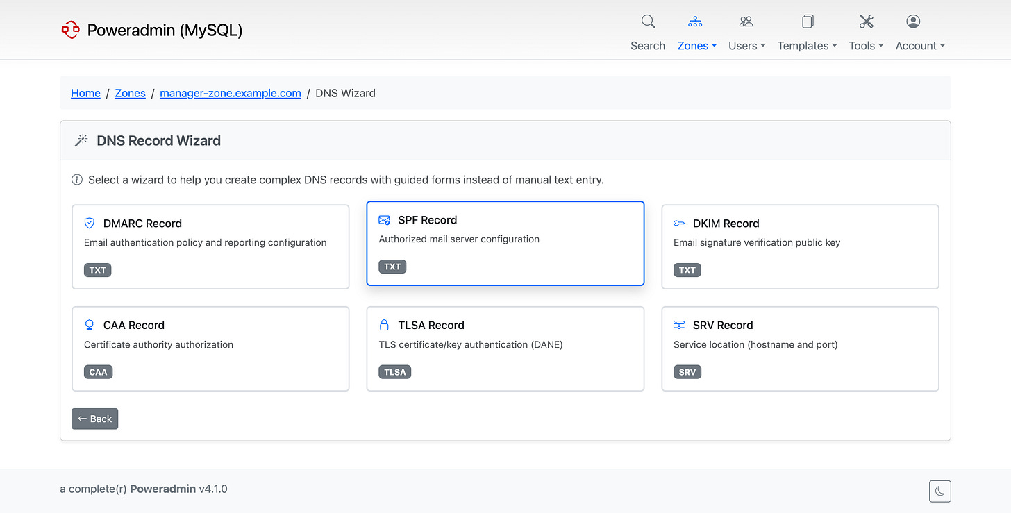 New interactive wizards for DMARC, SPF, DKIM, CAA, TLSA, and SRV records. Instead of remembering record syntax, you fill in a form and the wizard generates the correct record. Input is validated in real-time, so you won’t end up with a broken SPF or DMARC record.