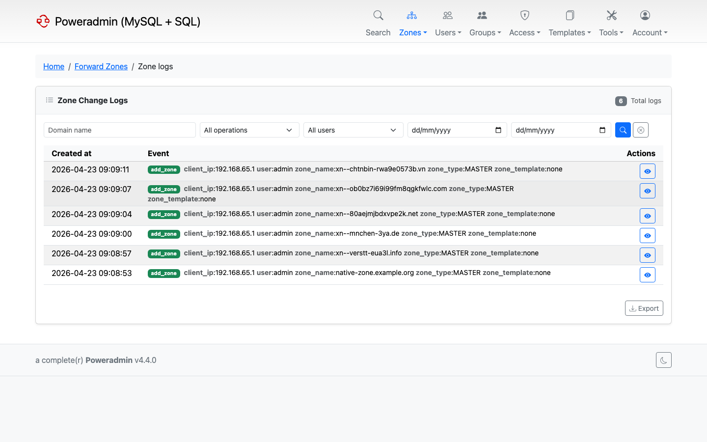 sql/poweradmin-mysql-update-to-4.3.0.sqlfrom the v4.3.1 release.Prefer to stay on the stable line? v4.2.2 remains the recommended release for production deployments that don’t need API backend mode or the other 4.3 features. It’s what the Docker