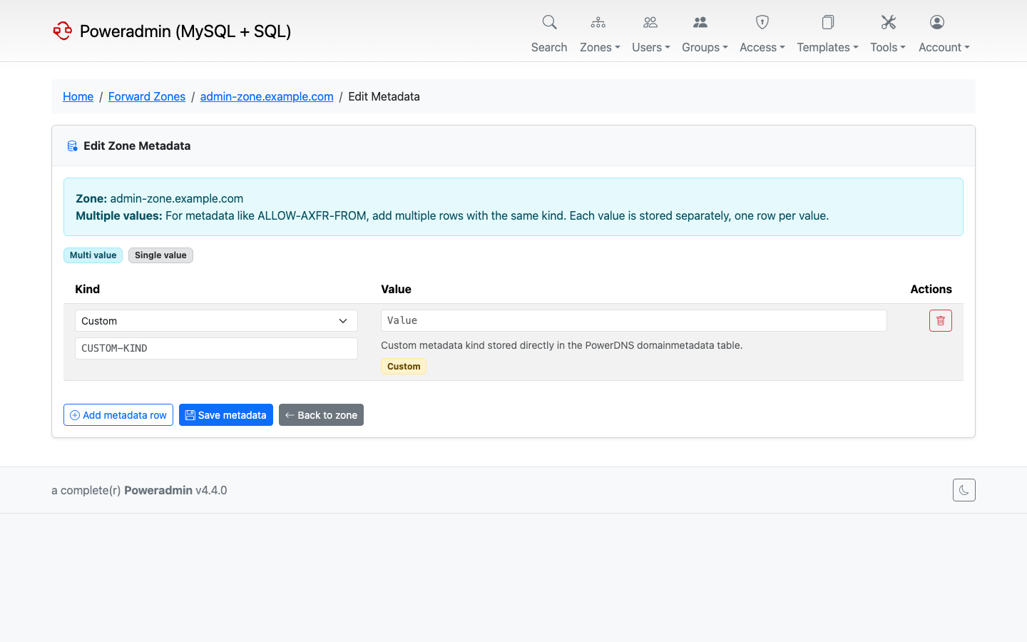A first-class editor for PowerDNS domainmetadata (#1117). Select from known kinds with inline guidance, enter custom kinds when needed, and manage multi-value kinds such as ALLOW-AXFR-FROM one row at a time. A read-only view is available for users without edit rights. Full API v2 CRUD is available at /v2/zones/{id}/metadata. SOA-EDIT-API is handled specially in API mode - surfaced from zone properties, editable inline, and removal propagated correctly.